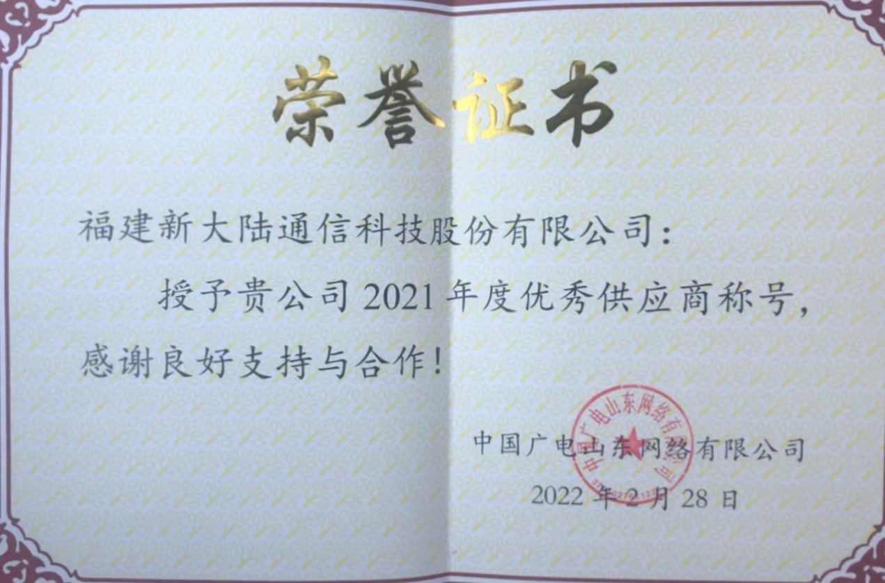 ????本刊訊:新大陸通信公司堅守“保質(zhì)量、保供貨、保服務(wù)”承諾,勇挑第一批供貨的重擔(dān)并持續(xù)穩(wěn)定供貨,得到了中國廣電山東網(wǎng)絡(luò)有限公司的認(rèn)可,獲得“2021年度優(yōu)秀供應(yīng)商”榮譽稱號。今后公司將始終如一、勇于承擔(dān),為每一位客戶提供全方位滿意的服務(wù)。